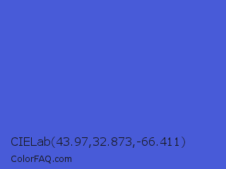 CIELab 43.97,32.873,-66.411 Color is a normal blue color and the nearest color is Royal Blue #4169e1. Hex code #485bd8 and RGB value is rgb(72,91,216). In RGB color space, this color is composed of 28% red, 36% green, 85% blue, In CMYK color space, this color is composed of 67% cyan, 58% magenta, 0% yellow , 15% black , In HSL color space, this color has a hue angle of 232° , 65% saturation and 56% lightness.