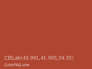 CIELab 43.991,41.995,34.35 Color is a normal red color and the nearest color is Medium Carmine #af4035. Hex code #b04631 and RGB value is rgb(176,70,49). In RGB color space, this color is composed of 69% red, 27% green, 19% blue, In CMYK color space, this color is composed of 0% cyan, 60% magenta, 72% yellow , 31% black , In HSL color space, this color has a hue angle of 10° , 56% saturation and 44% lightness.