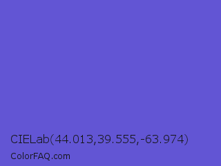 CIELab 44.013,39.555,-63.974 Color is a normal indigo color and the nearest color is Majorelle Blue #6050dc. Hex code #6255d4 and RGB value is rgb(98,85,212). In RGB color space, this color is composed of 38% red, 33% green, 83% blue, In CMYK color space, this color is composed of 54% cyan, 60% magenta, 0% yellow , 17% black , In HSL color space, this color has a hue angle of 246° , 60% saturation and 58% lightness.