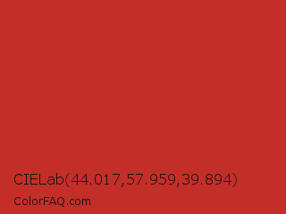 CIELab 44.017,57.959,39.894 Color is a normal red color and the nearest color is International Orange Golden Gate Bridge #c0362c. Hex code #c42e29 and RGB value is rgb(196,46,41). In RGB color space, this color is composed of 77% red, 18% green, 16% blue, In CMYK color space, this color is composed of 0% cyan, 77% magenta, 79% yellow , 23% black , In HSL color space, this color has a hue angle of 2° , 65% saturation and 46% lightness.