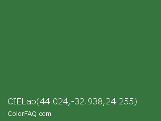 CIELab 44.024,-32.938,24.255 Color is a normal green color and the nearest color is Killarney #3a6a47. Hex code #36753e and RGB value is rgb(54,117,62). In RGB color space, this color is composed of 21% red, 46% green, 24% blue, In CMYK color space, this color is composed of 54% cyan, 0% magenta, 47% yellow , 54% black , In HSL color space, this color has a hue angle of 128° , 37% saturation and 34% lightness.