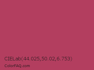 CIELab 44.025,50.02,6.753 Color is a normal rose color and the nearest color is Hippie Pink #ae4560. Hex code #b33e5f and RGB value is rgb(179,62,95). In RGB color space, this color is composed of 70% red, 24% green, 37% blue, In CMYK color space, this color is composed of 0% cyan, 65% magenta, 47% yellow , 30% black , In HSL color space, this color has a hue angle of 343° , 49% saturation and 47% lightness.