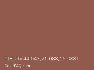 CIELab 44.043,21.088,16.988 Color is a normal red color and the nearest color is Spicy Mix #8b5f4d. Hex code #915a4d and RGB value is rgb(145,90,77). In RGB color space, this color is composed of 57% red, 35% green, 30% blue, In CMYK color space, this color is composed of 0% cyan, 38% magenta, 47% yellow , 43% black , In HSL color space, this color has a hue angle of 11° , 31% saturation and 44% lightness.