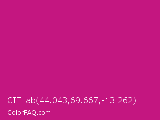 CIELab 44.043,69.667,-13.262 Color is a normal magenta color and the nearest color is Red Violet #c71585. Hex code #c41680 and RGB value is rgb(196,22,128). In RGB color space, this color is composed of 77% red, 9% green, 50% blue, In CMYK color space, this color is composed of 0% cyan, 89% magenta, 35% yellow , 23% black , In HSL color space, this color has a hue angle of 323° , 80% saturation and 43% lightness.