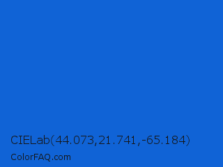 CIELab 44.073,21.741,-65.184 Color is a normal blue color and the nearest color is Science Blue #0066cc. Hex code #1063d6 and RGB value is rgb(16,99,214). In RGB color space, this color is composed of 6% red, 39% green, 84% blue, In CMYK color space, this color is composed of 93% cyan, 54% magenta, 0% yellow , 16% black , In HSL color space, this color has a hue angle of 215° , 86% saturation and 45% lightness.