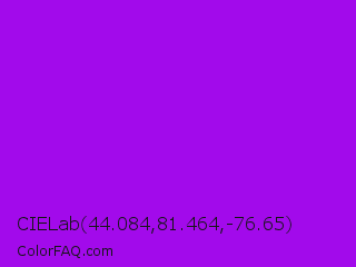 CIELab 44.084,81.464,-76.65 Color is a normal purple color and the nearest color is Vivid Violet #9f00ff. Hex code #a20aeb and RGB value is rgb(162,10,235). In RGB color space, this color is composed of 64% red, 4% green, 92% blue, In CMYK color space, this color is composed of 31% cyan, 96% magenta, 0% yellow , 8% black , In HSL color space, this color has a hue angle of 281° , 92% saturation and 48% lightness.