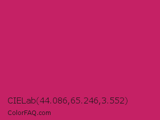 CIELab 44.086,65.246,3.552 Color is a normal rose color and the nearest color is Rose Red #c21e56. Hex code #c52165 and RGB value is rgb(197,33,101). In RGB color space, this color is composed of 77% red, 13% green, 40% blue, In CMYK color space, this color is composed of 0% cyan, 83% magenta, 49% yellow , 23% black , In HSL color space, this color has a hue angle of 335° , 71% saturation and 45% lightness.
