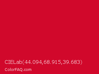 CIELab 44.094,68.915,39.683 Color is a normal red color and the nearest color is Vivid Crimson #cc0033. Hex code #d1082b and RGB value is rgb(209,8,43). In RGB color space, this color is composed of 82% red, 3% green, 17% blue, In CMYK color space, this color is composed of 0% cyan, 96% magenta, 79% yellow , 18% black , In HSL color space, this color has a hue angle of 350° , 93% saturation and 43% lightness.