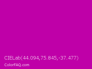 CIELab 44.094,75.845,-37.477 Color is a normal magenta color and the nearest color is Heliotrope Magenta #aa00bb. Hex code #bf00a8 and RGB value is rgb(191,0,168). In RGB color space, this color is composed of 75% red, 0% green, 66% blue, In CMYK color space, this color is composed of 0% cyan, 100% magenta, 12% yellow , 25% black , In HSL color space, this color has a hue angle of 307° , 100% saturation and 37% lightness.