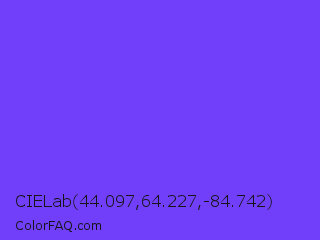 CIELab 44.097,64.227,-84.742 Color is a light indigo color and the nearest color is Majorelle Blue #6050dc. Hex code #713ff9 and RGB value is rgb(113,63,249). In RGB color space, this color is composed of 44% red, 25% green, 98% blue, In CMYK color space, this color is composed of 55% cyan, 75% magenta, 0% yellow , 2% black , In HSL color space, this color has a hue angle of 256° , 94% saturation and 61% lightness.