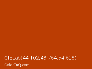 CIELab 44.102,48.764,54.618 Color is a normal orange color and the nearest color is Mahogany #c04000. Hex code #bb3d03 and RGB value is rgb(187,61,3). In RGB color space, this color is composed of 73% red, 24% green, 1% blue, In CMYK color space, this color is composed of 0% cyan, 67% magenta, 98% yellow , 27% black , In HSL color space, this color has a hue angle of 19° , 97% saturation and 37% lightness.