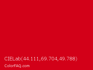 CIELab 44.111,69.704,49.788 Color is a normal red color and the nearest color is Harvard Crimson #c90016. Hex code #d30018 and RGB value is rgb(211,0,24). In RGB color space, this color is composed of 83% red, 0% green, 9% blue, In CMYK color space, this color is composed of 0% cyan, 100% magenta, 89% yellow , 17% black , In HSL color space, this color has a hue angle of 353° , 100% saturation and 41% lightness.