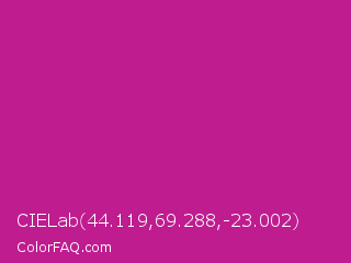 CIELab 44.119,69.288,-23.002 Color is a normal magenta color and the nearest color is Red Violet #c71585. Hex code #bf1c90 and RGB value is rgb(191,28,144). In RGB color space, this color is composed of 75% red, 11% green, 56% blue, In CMYK color space, this color is composed of 0% cyan, 85% magenta, 25% yellow , 25% black , In HSL color space, this color has a hue angle of 317° , 74% saturation and 43% lightness.