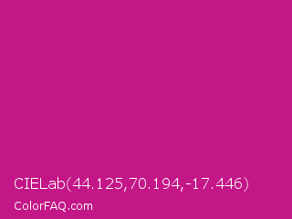 CIELab 44.125,70.194,-17.446 Color is a normal magenta color and the nearest color is Red Violet #c71585. Hex code #c31687 and RGB value is rgb(195,22,135). In RGB color space, this color is composed of 76% red, 9% green, 53% blue, In CMYK color space, this color is composed of 0% cyan, 89% magenta, 31% yellow , 24% black , In HSL color space, this color has a hue angle of 321° , 80% saturation and 43% lightness.
