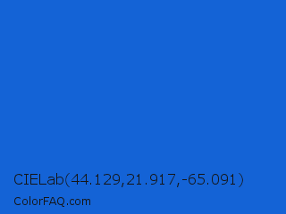 CIELab 44.129,21.917,-65.091 Color is a normal blue color and the nearest color is Bright Navy Blue #1974d2. Hex code #1463d6 and RGB value is rgb(20,99,214). In RGB color space, this color is composed of 8% red, 39% green, 84% blue, In CMYK color space, this color is composed of 91% cyan, 54% magenta, 0% yellow , 16% black , In HSL color space, this color has a hue angle of 216° , 83% saturation and 46% lightness.