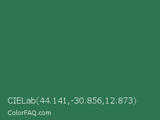 CIELab 44.141,-30.856,12.873 Color is a normal green color and the nearest color is Amazon #3b7a57. Hex code #2f7552 and RGB value is rgb(47,117,82). In RGB color space, this color is composed of 18% red, 46% green, 32% blue, In CMYK color space, this color is composed of 60% cyan, 0% magenta, 30% yellow , 54% black , In HSL color space, this color has a hue angle of 150° , 43% saturation and 32% lightness.