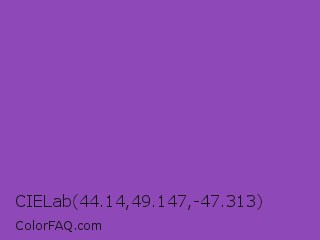 CIELab 44.14,49.147,-47.313 Color is a normal purple color and the nearest color is Purple Plum #9c51b6. Hex code #8f48b8 and RGB value is rgb(143,72,184). In RGB color space, this color is composed of 56% red, 28% green, 72% blue, In CMYK color space, this color is composed of 22% cyan, 61% magenta, 0% yellow , 28% black , In HSL color space, this color has a hue angle of 278° , 44% saturation and 50% lightness.