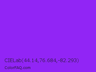 CIELab 44.14,76.684,-82.293 Color is a normal purple color and the nearest color is Veronica #a020f0. Hex code #9125f5 and RGB value is rgb(145,37,245). In RGB color space, this color is composed of 57% red, 15% green, 96% blue, In CMYK color space, this color is composed of 41% cyan, 85% magenta, 0% yellow , 4% black , In HSL color space, this color has a hue angle of 271° , 91% saturation and 55% lightness.