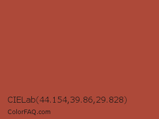 CIELab 44.154,39.86,29.828 Color is a normal red color and the nearest color is Medium Carmine #af4035. Hex code #ad4939 and RGB value is rgb(173,73,57). In RGB color space, this color is composed of 68% red, 29% green, 22% blue, In CMYK color space, this color is composed of 0% cyan, 58% magenta, 67% yellow , 32% black , In HSL color space, this color has a hue angle of 8° , 50% saturation and 45% lightness.