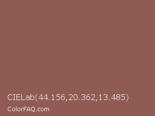 CIELab 44.156,20.362,13.485 Color is a normal red color and the nearest color is Spicy Mix #8b5f4d. Hex code #8f5b53 and RGB value is rgb(143,91,83). In RGB color space, this color is composed of 56% red, 36% green, 33% blue, In CMYK color space, this color is composed of 0% cyan, 36% magenta, 42% yellow , 44% black , In HSL color space, this color has a hue angle of 8° , 27% saturation and 44% lightness.