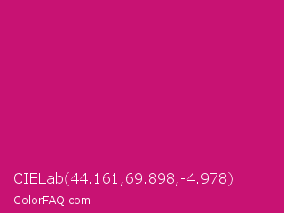 CIELab 44.161,69.898,-4.978 Color is a normal rose color and the nearest color is Magenta Dye #ca1f7b. Hex code #c81273 and RGB value is rgb(200,18,115). In RGB color space, this color is composed of 78% red, 7% green, 45% blue, In CMYK color space, this color is composed of 0% cyan, 91% magenta, 43% yellow , 22% black , In HSL color space, this color has a hue angle of 328° , 83% saturation and 43% lightness.
