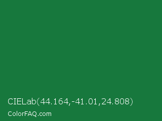 CIELab 44.164,-41.01,24.808 Color is a dark green color and the nearest color is Dark Spring Green #177245. Hex code #17783d and RGB value is rgb(23,120,61). In RGB color space, this color is composed of 9% red, 47% green, 24% blue, In CMYK color space, this color is composed of 81% cyan, 0% magenta, 49% yellow , 53% black , In HSL color space, this color has a hue angle of 144° , 68% saturation and 28% lightness.