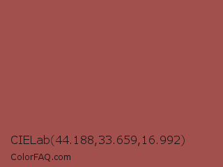 CIELab 44.188,33.659,16.992 Color is a normal red color and the nearest color is Middle Red Purple #a55353. Hex code #a2504e and RGB value is rgb(162,80,78). In RGB color space, this color is composed of 64% red, 31% green, 31% blue, In CMYK color space, this color is composed of 0% cyan, 51% magenta, 52% yellow , 36% black , In HSL color space, this color has a hue angle of 1° , 35% saturation and 47% lightness.