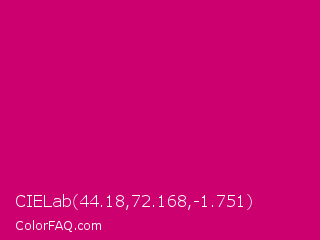 CIELab 44.18,72.168,-1.751 Color is a normal rose color and the nearest color is Rubine Red #d10056. Hex code #cc006e and RGB value is rgb(204,0,110). In RGB color space, this color is composed of 80% red, 0% green, 43% blue, In CMYK color space, this color is composed of 0% cyan, 100% magenta, 46% yellow , 20% black , In HSL color space, this color has a hue angle of 328° , 100% saturation and 40% lightness.
