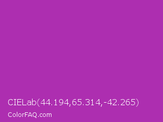 CIELab 44.194,65.314,-42.265 Color is a normal magenta color and the nearest color is Byzantine #bd33a4. Hex code #ad2eb0 and RGB value is rgb(173,46,176). In RGB color space, this color is composed of 68% red, 18% green, 69% blue, In CMYK color space, this color is composed of 2% cyan, 74% magenta, 0% yellow , 31% black , In HSL color space, this color has a hue angle of 299° , 59% saturation and 44% lightness.