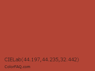 CIELab 44.197,44.235,32.442 Color is a normal red color and the nearest color is Medium Carmine #af4035. Hex code #b34435 and RGB value is rgb(179,68,53). In RGB color space, this color is composed of 70% red, 27% green, 21% blue, In CMYK color space, this color is composed of 0% cyan, 62% magenta, 70% yellow , 30% black , In HSL color space, this color has a hue angle of 7° , 54% saturation and 45% lightness.
