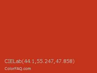 CIELab 44.1,55.247,47.858 Color is a normal red color and the nearest color is Thunderbird #c02b18. Hex code #c23319 and RGB value is rgb(194,51,25). In RGB color space, this color is composed of 76% red, 20% green, 10% blue, In CMYK color space, this color is composed of 0% cyan, 74% magenta, 87% yellow , 24% black , In HSL color space, this color has a hue angle of 9° , 77% saturation and 43% lightness.