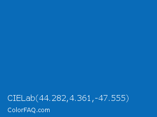 CIELab 44.282,4.361,-47.555 Color is a normal blue color and the nearest color is Spanish Blue #0070b8. Hex code #096bb8 and RGB value is rgb(9,107,184). In RGB color space, this color is composed of 4% red, 42% green, 72% blue, In CMYK color space, this color is composed of 95% cyan, 42% magenta, 0% yellow , 28% black , In HSL color space, this color has a hue angle of 206° , 91% saturation and 38% lightness.