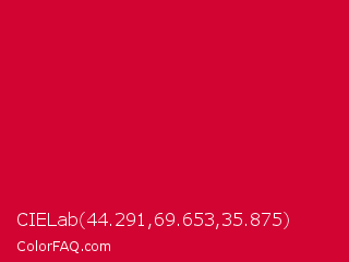 CIELab 44.291,69.653,35.875 Color is a normal red color and the nearest color is Vivid Crimson #cc0033. Hex code #d20532 and RGB value is rgb(210,5,50). In RGB color space, this color is composed of 82% red, 2% green, 20% blue, In CMYK color space, this color is composed of 0% cyan, 98% magenta, 76% yellow , 18% black , In HSL color space, this color has a hue angle of 347° , 95% saturation and 42% lightness.