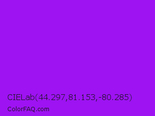 CIELab 44.297,81.153,-80.285 Color is a normal purple color and the nearest color is Veronica #a020f0. Hex code #9d13f2 and RGB value is rgb(157,19,242). In RGB color space, this color is composed of 62% red, 7% green, 95% blue, In CMYK color space, this color is composed of 35% cyan, 92% magenta, 0% yellow , 5% black , In HSL color space, this color has a hue angle of 277° , 90% saturation and 51% lightness.