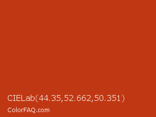 CIELab 44.35,52.662,50.351 Color is a normal red color and the nearest color is Tia Maria #c1440e. Hex code #c03813 and RGB value is rgb(192,56,19). In RGB color space, this color is composed of 75% red, 22% green, 7% blue, In CMYK color space, this color is composed of 0% cyan, 71% magenta, 90% yellow , 25% black , In HSL color space, this color has a hue angle of 13° , 82% saturation and 41% lightness.
