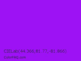 CIELab 44.366,81.77,-81.866 Color is a normal purple color and the nearest color is Veronica #a020f0. Hex code #9c12f5 and RGB value is rgb(156,18,245). In RGB color space, this color is composed of 61% red, 7% green, 96% blue, In CMYK color space, this color is composed of 36% cyan, 93% magenta, 0% yellow , 4% black , In HSL color space, this color has a hue angle of 276° , 92% saturation and 52% lightness.