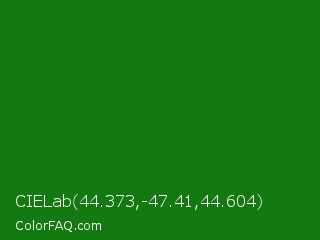 CIELab 44.373,-47.41,44.604 Color is a dark green color and the nearest color is India Green #138808. Hex code #137a11 and RGB value is rgb(19,122,17). In RGB color space, this color is composed of 7% red, 48% green, 7% blue, In CMYK color space, this color is composed of 84% cyan, 0% magenta, 86% yellow , 52% black , In HSL color space, this color has a hue angle of 119° , 76% saturation and 27% lightness.