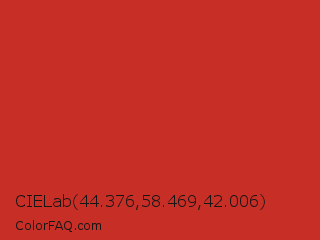 CIELab 44.376,58.469,42.006 Color is a normal red color and the nearest color is International Orange Golden Gate Bridge #c0362c. Hex code #c62e26 and RGB value is rgb(198,46,38). In RGB color space, this color is composed of 78% red, 18% green, 15% blue, In CMYK color space, this color is composed of 0% cyan, 77% magenta, 81% yellow , 22% black , In HSL color space, this color has a hue angle of 3° , 68% saturation and 46% lightness.