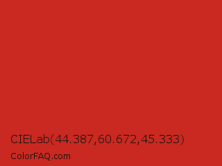 CIELab 44.387,60.672,45.333 Color is a normal red color and the nearest color is Thunderbird #c02b18. Hex code #c92920 and RGB value is rgb(201,41,32). In RGB color space, this color is composed of 79% red, 16% green, 13% blue, In CMYK color space, this color is composed of 0% cyan, 80% magenta, 84% yellow , 21% black , In HSL color space, this color has a hue angle of 3° , 73% saturation and 46% lightness.