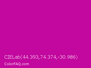 CIELab 44.393,74.374,-30.986 Color is a normal magenta color and the nearest color is Red Violet #c71585. Hex code #c2089e and RGB value is rgb(194,8,158). In RGB color space, this color is composed of 76% red, 3% green, 62% blue, In CMYK color space, this color is composed of 0% cyan, 96% magenta, 19% yellow , 24% black , In HSL color space, this color has a hue angle of 312° , 92% saturation and 40% lightness.