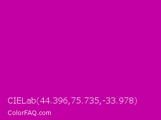 CIELab 44.396,75.735,-33.978 Color is a normal magenta color and the nearest color is Heliotrope Magenta #aa00bb. Hex code #c200a3 and RGB value is rgb(194,0,163). In RGB color space, this color is composed of 76% red, 0% green, 64% blue, In CMYK color space, this color is composed of 0% cyan, 100% magenta, 16% yellow , 24% black , In HSL color space, this color has a hue angle of 310° , 100% saturation and 38% lightness.