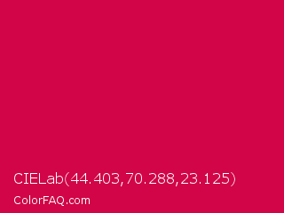 CIELab 44.403,70.288,23.125 Color is a normal rose color and the nearest color is Spanish Carmine #d10047. Hex code #d10547 and RGB value is rgb(209,5,71). In RGB color space, this color is composed of 82% red, 2% green, 28% blue, In CMYK color space, this color is composed of 0% cyan, 98% magenta, 66% yellow , 18% black , In HSL color space, this color has a hue angle of 341° , 95% saturation and 42% lightness.