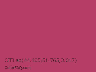 CIELab 44.405,51.765,3.017 Color is a normal rose color and the nearest color is Deep Blush #b44668. Hex code #b53d66 and RGB value is rgb(181,61,102). In RGB color space, this color is composed of 71% red, 24% green, 40% blue, In CMYK color space, this color is composed of 0% cyan, 66% magenta, 44% yellow , 29% black , In HSL color space, this color has a hue angle of 340° , 50% saturation and 47% lightness.