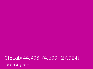 CIELab 44.408,74.509,-27.924 Color is a normal magenta color and the nearest color is Red Violet #c71585. Hex code #c40499 and RGB value is rgb(196,4,153). In RGB color space, this color is composed of 77% red, 2% green, 60% blue, In CMYK color space, this color is composed of 0% cyan, 98% magenta, 22% yellow , 23% black , In HSL color space, this color has a hue angle of 313° , 96% saturation and 39% lightness.