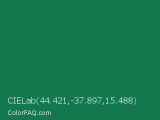 CIELab 44.421,-37.897,15.488 Color is a dark green color and the nearest color is Dark Spring Green #177245. Hex code #14784e and RGB value is rgb(20,120,78). In RGB color space, this color is composed of 8% red, 47% green, 31% blue, In CMYK color space, this color is composed of 83% cyan, 0% magenta, 35% yellow , 53% black , In HSL color space, this color has a hue angle of 155° , 71% saturation and 27% lightness.