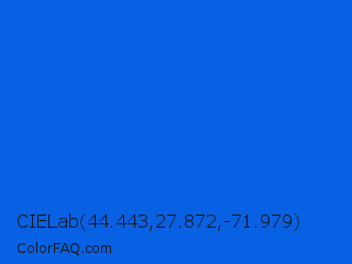 CIELab 44.443,27.872,-71.979 Color is a normal blue color and the nearest color is Science Blue #0066cc. Hex code #0861e3 and RGB value is rgb(8,97,227). In RGB color space, this color is composed of 3% red, 38% green, 89% blue, In CMYK color space, this color is composed of 96% cyan, 57% magenta, 0% yellow , 11% black , In HSL color space, this color has a hue angle of 216° , 93% saturation and 46% lightness.
