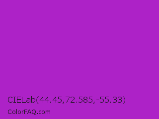 CIELab 44.45,72.585,-55.33 Color is a normal purple color and the nearest color is Dark Orchid #9932cc. Hex code #ad22c7 and RGB value is rgb(173,34,199). In RGB color space, this color is composed of 68% red, 13% green, 78% blue, In CMYK color space, this color is composed of 13% cyan, 83% magenta, 0% yellow , 22% black , In HSL color space, this color has a hue angle of 291° , 71% saturation and 46% lightness.