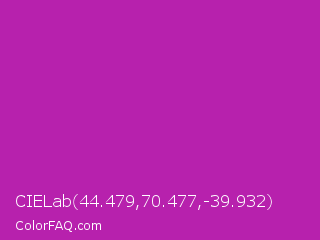 CIELab 44.479,70.477,-39.932 Color is a normal magenta color and the nearest color is Byzantine #bd33a4. Hex code #b721ad and RGB value is rgb(183,33,173). In RGB color space, this color is composed of 72% red, 13% green, 68% blue, In CMYK color space, this color is composed of 0% cyan, 82% magenta, 5% yellow , 28% black , In HSL color space, this color has a hue angle of 304° , 69% saturation and 42% lightness.