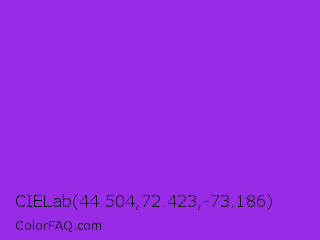 CIELab 44.504,72.423,-73.186 Color is a normal purple color and the nearest color is Blue Violet #8a2be2. Hex code #982ce6 and RGB value is rgb(152,44,230). In RGB color space, this color is composed of 60% red, 17% green, 90% blue, In CMYK color space, this color is composed of 34% cyan, 81% magenta, 0% yellow , 10% black , In HSL color space, this color has a hue angle of 275° , 79% saturation and 54% lightness.