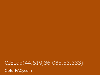 CIELab 44.519,36.085,53.333 Color is a normal orange color and the nearest color is Rich Gold #a85307. Hex code #ad4d04 and RGB value is rgb(173,77,4). In RGB color space, this color is composed of 68% red, 30% green, 2% blue, In CMYK color space, this color is composed of 0% cyan, 55% magenta, 98% yellow , 32% black , In HSL color space, this color has a hue angle of 26° , 95% saturation and 35% lightness.